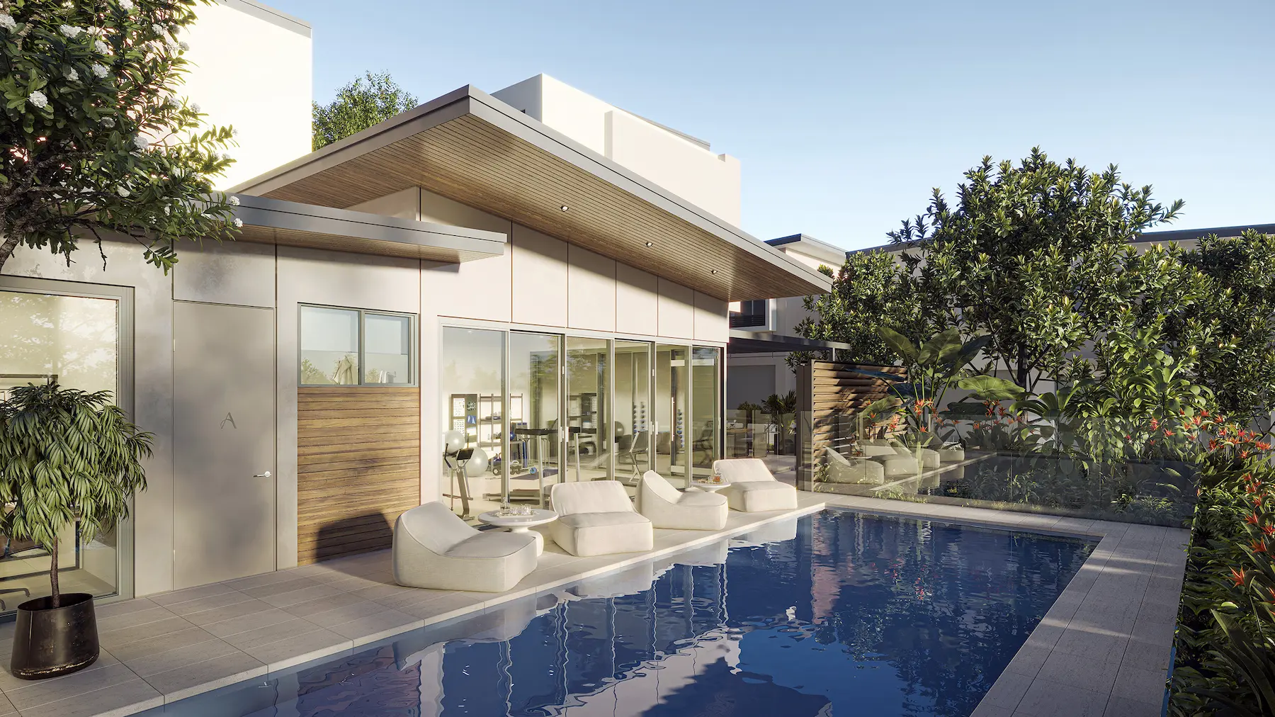 - 獨家住戶專用游泳池,周圍環繞蔥鬱植物增強隱私