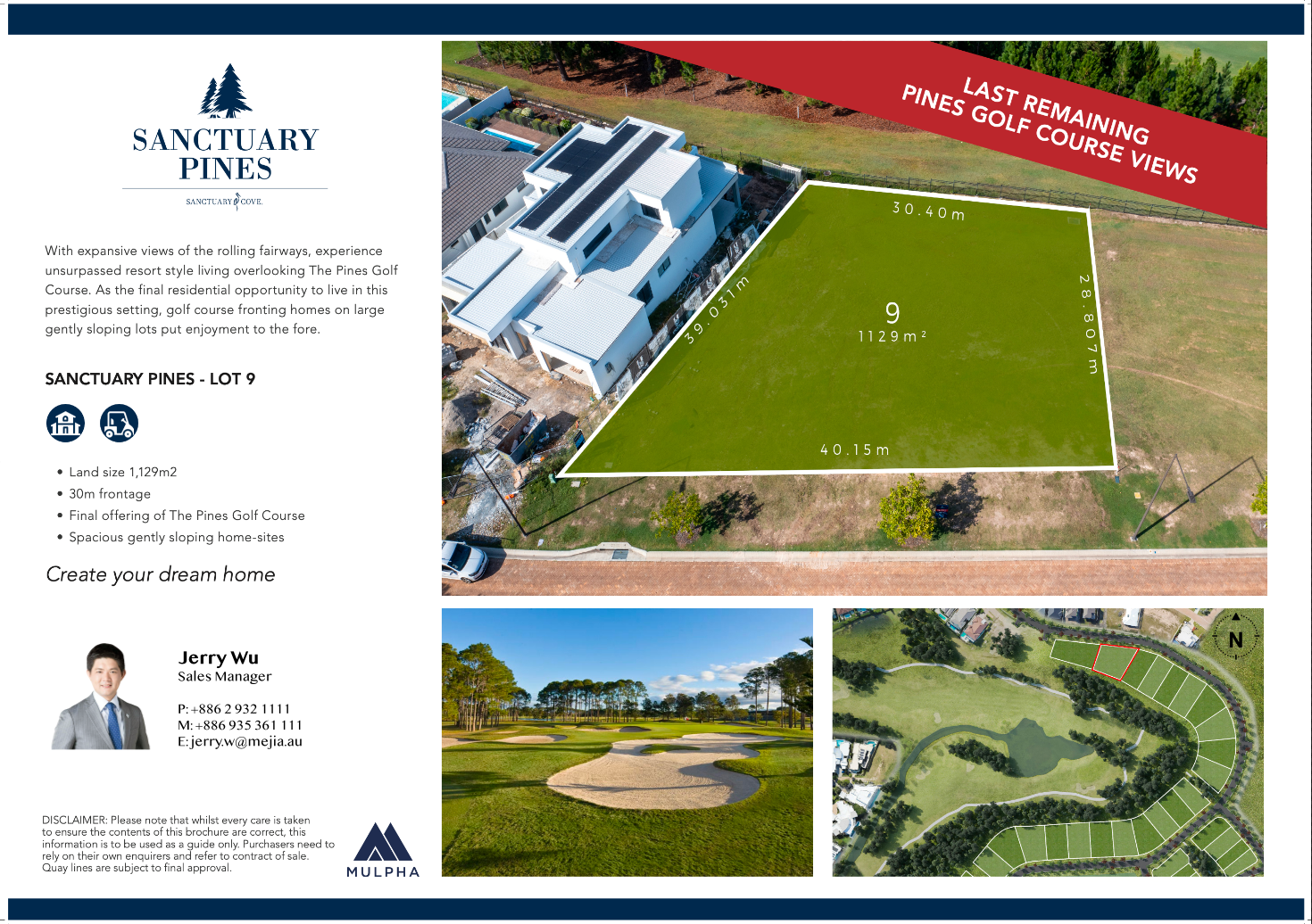 - 臨高爾夫生活 (Living Golfside):Sanctuary Pines區域是最後一個可在The Pines高爾夫球場旁建造夢想家園的機會,地塊面積從760平方米至1209平方米,部分地塊有輕微斜坡