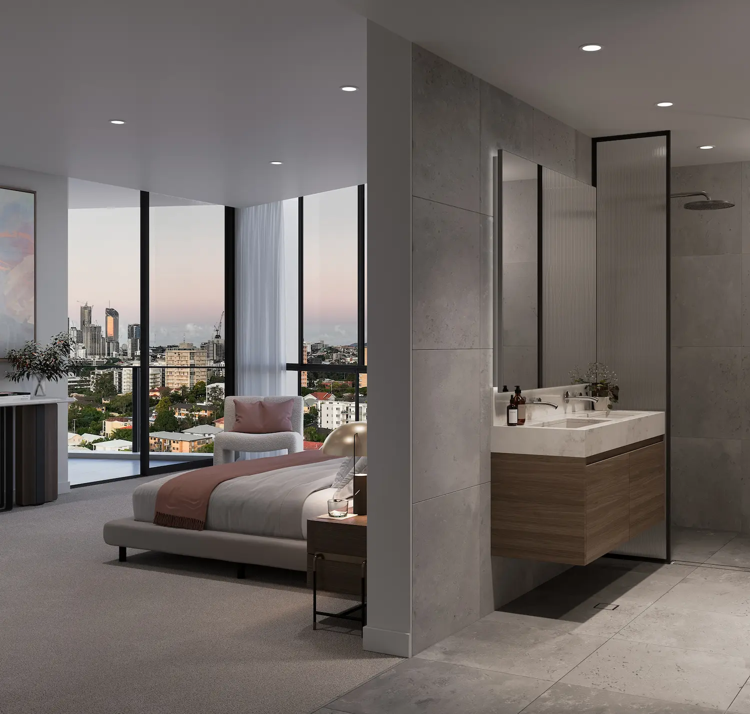 The Adler Auchenflower 的設計理念注重採光和景觀視野。住宅內部採用中性色調配色,搭配木質材料和天然石材元素。大面積玻璃窗設計讓住戶可以欣賞到布里斯本天際線的景色。